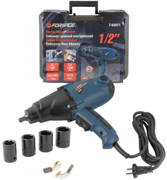 ELEKTROMOS Ütvefúrószár 450Nm - 1010W -230V CÉG: FORSAGE Modell: F-03071(14910 kód) MŰSZAKI ADATOK: Feszültség: 230 V Teljesítmény: 1010 W Fúrószár: 1/2" Nyomaték: 450Nm Üresjárati fordulatszám:0-2200ford/min Súly: 5,5 kg Kábelhossz: 3 mJellemzők: Erős kulcs ütésfunkcióval és fordulatszámállítással, valamint forgásirány-változtatással. A csomagban található ütvecsatlakozók: 17mm, 19mm, 21mm, 22mm. A csatlakozók króm-molibdén acélból készültek. A Cr-Mo acél egy egyedülálló ötvözet, amely kétszer nagyobb húzóerővel rendelkezik, mint a szokásos szénacél, és háromszor magasabb műanyag határértékkel. Az egész praktikus táskában van csomagolva