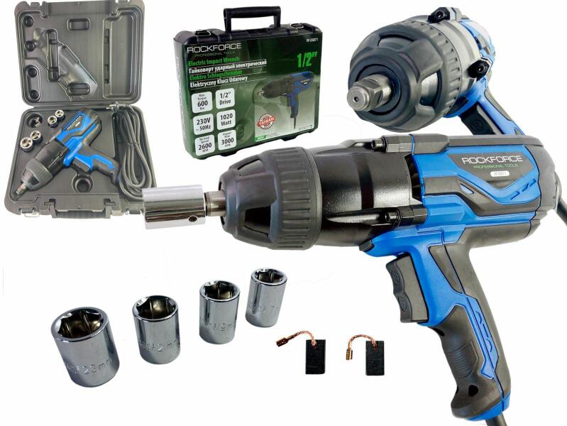 ELEKTROMOS 600Nm Nyomatékos Kulcs - 1020W -230V Cég: Rockforce Modell: RF-03071(kód 50167) TECHNIKAI ADATOK: Feszültség: 230 V Teljesítmény: 1020 W Tengely: 1/2" Nyomaték: 600Nm Üresjárati fordulatszám:0-2600ford/min Tömeg:3,96 kgJellemzők: Erős kulcs ütési funkcióval és fordulatszám-szabályozási lehetőséggel, valamint forgatási irány változtatással. A csomag tartalmazza az ütésekhez való fejeket: 17mm, 19mm, 21mm, 23mm. Az egész egy praktikus táskába van csomagolva!!!!!Kábel hossza: 2 m.