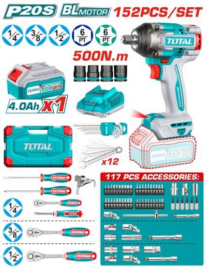 TotalTools TOTAL Tools Li-ion akkus ütvecsavarozó 500 Nm/152db kéziszerszám készlet/INDUSTRIAL (THKTHP31522)